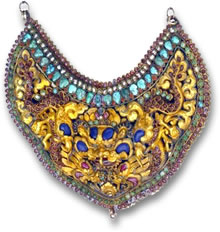 Breastplates have been around for centuries. They have been worn for protection against injury to the torso by soldiers, and also for spiritual protection, by ancient Egyptians. Modern day birthstones - gems that are assigned to each month of the year - originate from the Breastplate of the Israelites' High Priest, Aaron, described in the Book of Exodus of the Bible. This was a sacred item that is also referred to as the "Breastplate of Judgement" because it was believed to have been used for divination purposes. Another type of religious breastplate is the Torah Breastplate (also known as Hoshen), which is not worn around the neck, but used to decorate Judaic scrolls (called Sefer Torah). This is usually made from silver and is thought to be connected with the Breastplate of Aaron. The Torah Breastplate design can vary according to region. Ancient Egyptian mummies have been found wrapped with protective pectoral ornaments and collar necklaces. For example, the mummy of King Tutankhamun had several such amulets, including falcon and scarab beetle pectorals decorated with lapis lazuli, turquoise, carnelian and other materials. Ancient Egyptian pectorals could be suspended from the neck or worn as brooches. They were generally placed on mummies over the body parts that they were intended to protect. Nowadays, African tribes such as the Maasai still fashion traditional and elaborate breastplate necklaces out of colorful beads and other materials. Gold Mesoamerican BreastplateAncient European ornamental breastplates tended to be made of gold and other metals, such as those of the Thracians of South-Eastern Europe and the Etruscans of ancient Italy. These were sometimes decorated with rosettes and images of animals, such as lions. Ancient Mesoamerican breastplates and pectorals were also made from hammered gold and decorated with human-like or supernatural images. Many Native American Indians from the Great Plains and Eastern Woodlands wore breastplates which were fashioned from long, slim beads known as hair pipes. These were worn by both men and women and made from conch shell, bone, rolled copper, silver, stone or glass. Hair pipe breastplates were often large, rectangular or chevron-shaped adornments, which sometimes featured tassels. The long beads were often strung onto buckskin cords. The hair pipe beads were sometimes several inches long and some breastplates contained over one hundred beads. Hair pipes were also used in choker necklaces and earrings. ![]() Himalayan Gemstone Breastplate