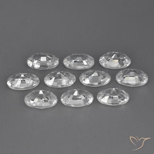These are 7.20 carat natural white Zircon gems, 10 pcs in oval shape with an exact size of 6.13 x 4.13 x 2.81 mm. These loose Zircon gemstones were mined in Cambodia and their clarity is VVS-VS (Eye Clean). This natural Zircon has been heated to enhance its vivid color.